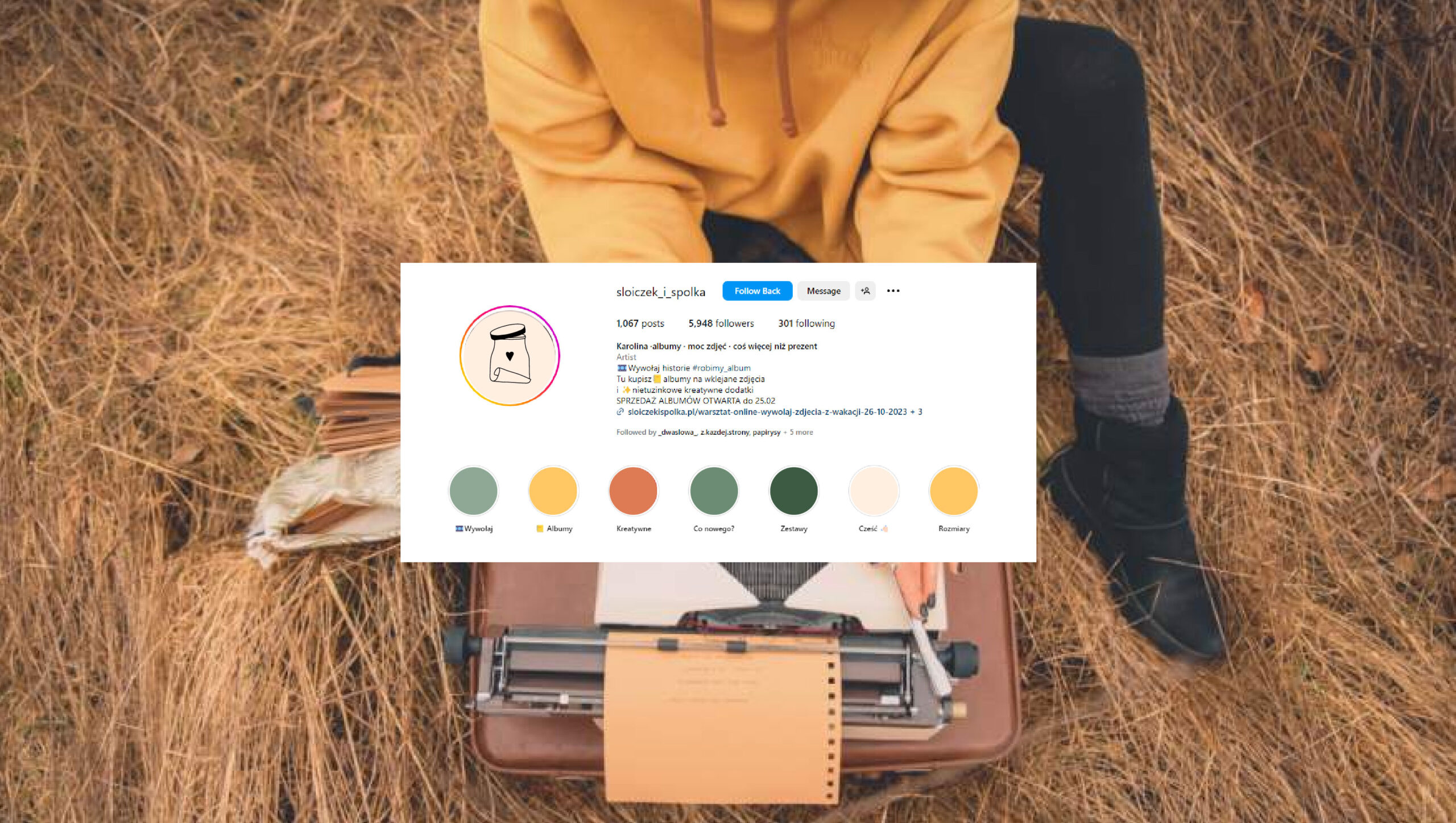 Wybór kolorów bazował na żółci, z którą Karolina już również była kojarzona. Dodałam do palety zgaszoną szałwiową zieleń, brudny pomarańcz i neutralny beż, który świetnie sprawdza się jako tło. Dodatkowo wprowadziłam fakturę tektury – skojarzenie z kartami albumu aby wzmocnić przekaz wizualny np. na instagramowych grafikach.